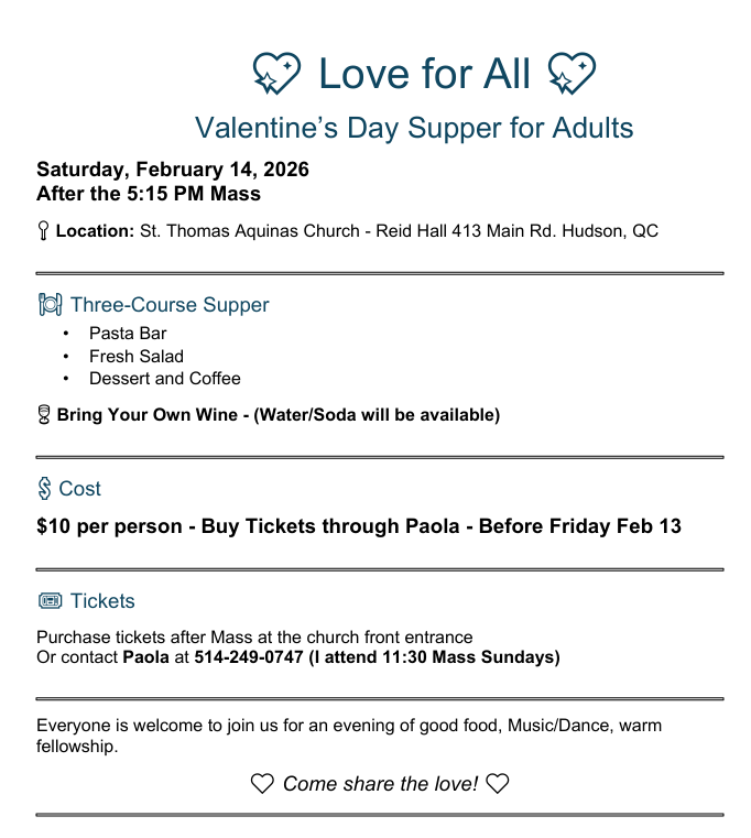 Buy your tickets: contact Paola at 514-249-0747 or in person at the church entrance (11:30 am mass)